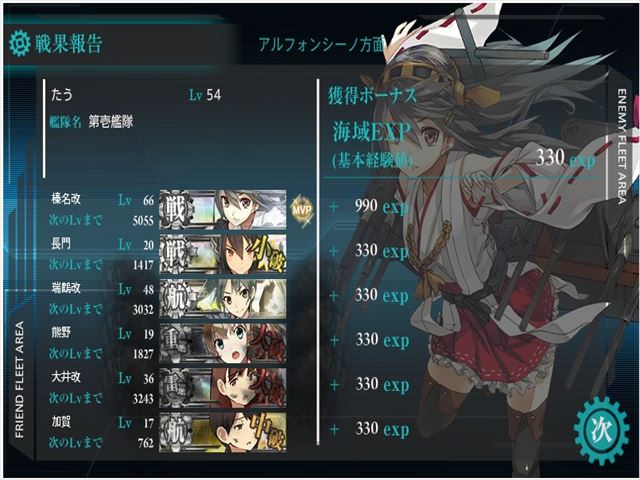 ちなみに一番最初はなんとなくLv.11の熊野を連れて行ったら途中で大破しやがりましたので、これは一応2周目ですね。